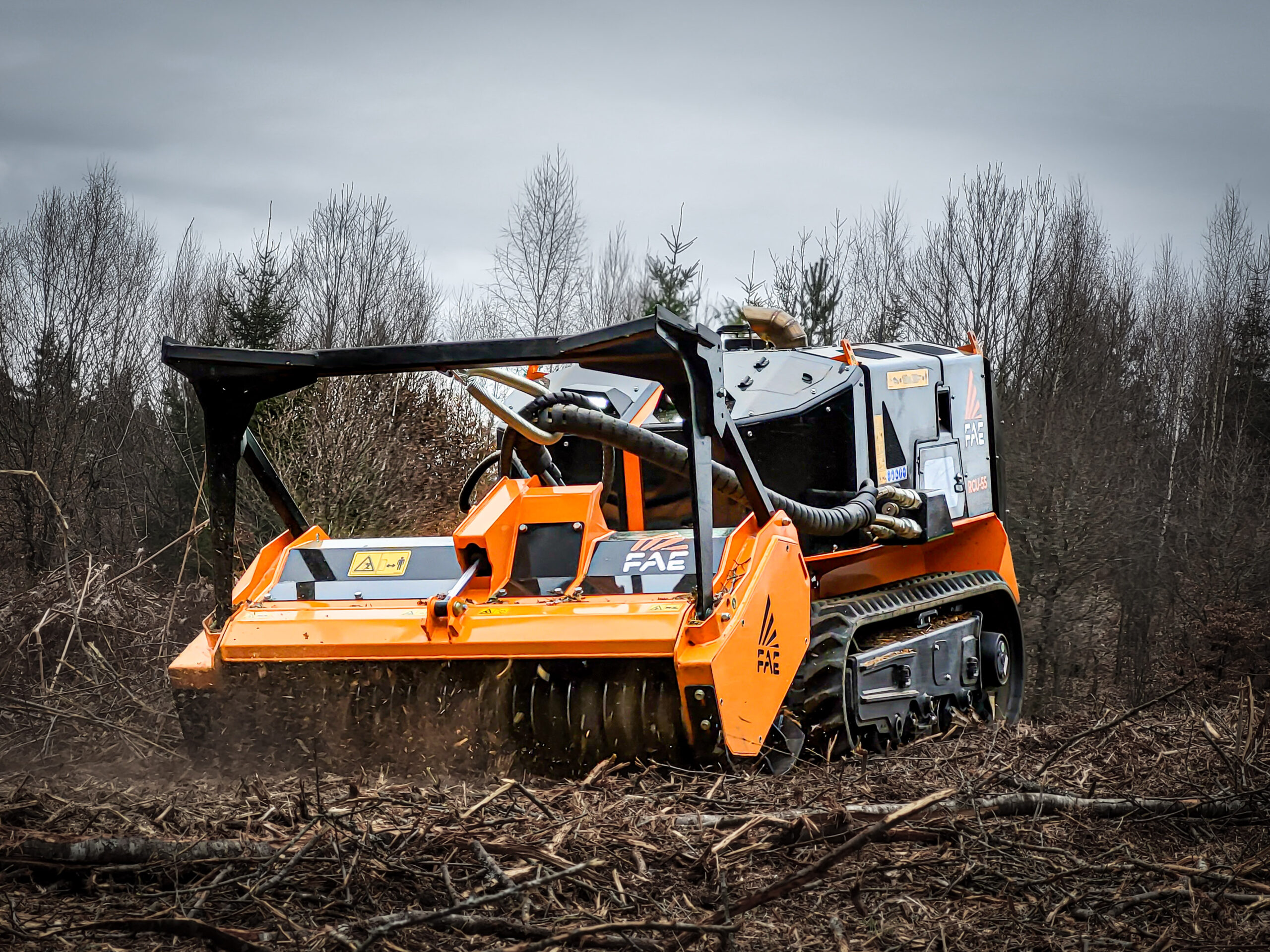 Concebido a partir de la dilatada experiencia de FAE en vehículos de la línea PT y sistemas Demining, el RCU 55 presenta una estructura de acero con todos los componentes integrados y protegidos. Su diseño destaca por un tren de rodaje Heavy Duty con vía variable hidráulica independiente, permitiendo ensanchar las orugas de 1450 mm a 1750 mm para maximizar la estabilidad en inclinaciones laterales pronunciadas. El sistema de tensado automático de las orugas de goma asegura que el equipo esté siempre listo para operar en las condiciones más difíciles sin intervenciones manuales constantes.